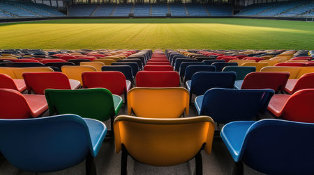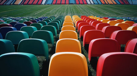The image captures vibrant empty seats in a stadium, creating a colorful contrast with the green grass field under bright daylight, showcasing a ready event atmosphere.