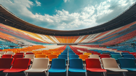 A clear view of empty stadium seating with rows of colorful seats under a bright sky, creating a vast and spacious feel