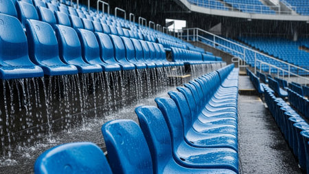 Rows of empty blue stadium seats are drenched in heavy rain, with water cascading down the tiers.