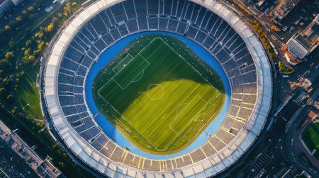 Aerial view of grand stadium aglow with sunset, embodying energy passion atmosphere of sports competitions, tournaments ready to welcome throngs of passionate fans and thrilling clash of athletes