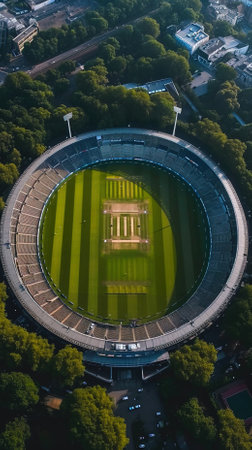 Captivating aerial view of a stadium at sunset, showcasing the empty field and surrounding cityscape. The warm light enhances the architectural beauty.