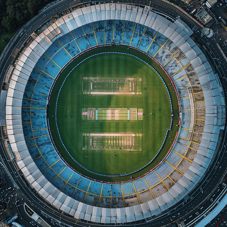 This captivating aerial image showcases a cricket stadium nestled within green mountains, highlighting the seamless blend of sports and nature.