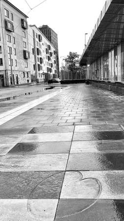Part of city real estate property and condo architecture. Detail in modern residential flat apartment building exterior. Fragment of new luxury house. Black and white.