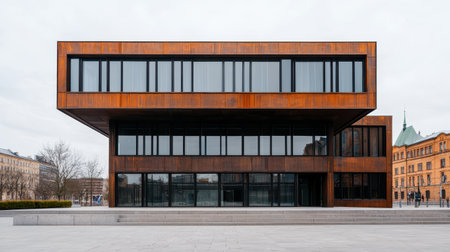 A modern architectural structure with a distinctive layered design, featuring large glass windows and a rust-colored facade.