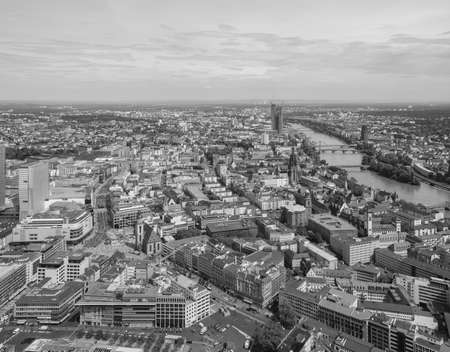 FRANKFURT AM MAIN, GERMANY - JUNE 3, 2013: Aerial view of the city centre with the largest business district in Europe - in black and white