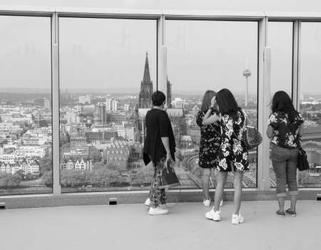 KOELN, GERMANY - CIRCA AUGUST 2019: People on Koelntriangle skyscraper sightseeing watching platform in black and white