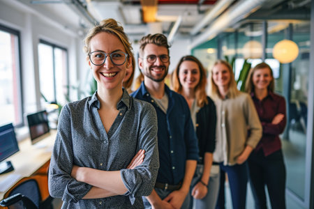 Five young professionals, including three women and two men, are standing together with their arms crossed in a modern office setting. They are all smiling confidently and looking directly at the camera, showcasing a sense of team spirit and unity.