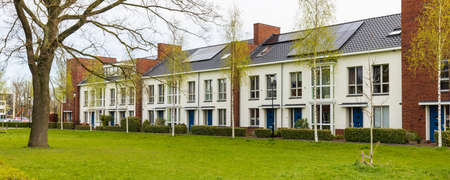 Row of modern newly build family houses along canal in Kortenoord in Wageningen, Gelderland in The Netherlands