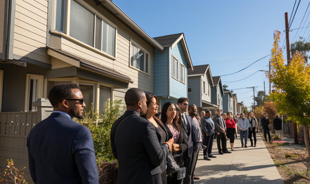 Several buildings with multiple balconies are featured in a daylight scene. The architectural style showcases symmetrical lines and repetitive patterns, with a clear blue sky overhead. This composition lends itself to visual storytelling about urban living, construction, and housing, suitable for editorial or commercial applications.