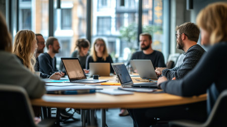 Group of professionals engaged in a collaborative meeting around a table with laptops in a modern office setting