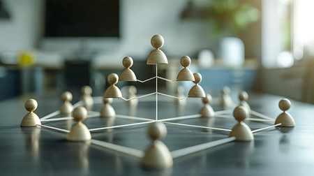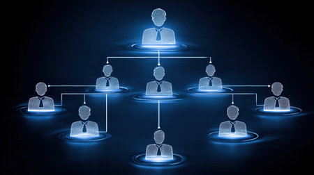 This digital artwork features a hierarchical structure with glowing figures and connections, symbolizing relationships and roles within a business framework. Ideal for tech and corporate themes.