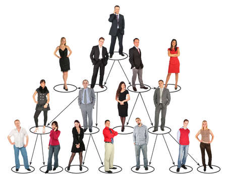 Leader at the head of hierarchical pyramid of the company. Traditional hierarchy concept. Superiors and subordinates. Meritocracy, corporate conformism. Personnel management. Cooperation and teamwork.