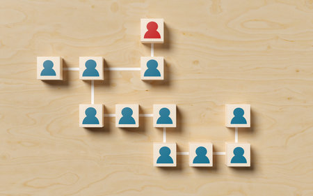 Wood cubes with people symbol in hierarchy diagram on wooden table background, business or company structure or team hierarchy concept, 3D illustration