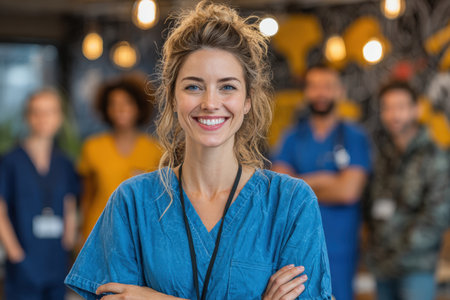 Confident female healthcare worker in blue scrubs stands in a vibrant medical setting, surrounded by colleagues, emphasizing collaboration and commitment to health services