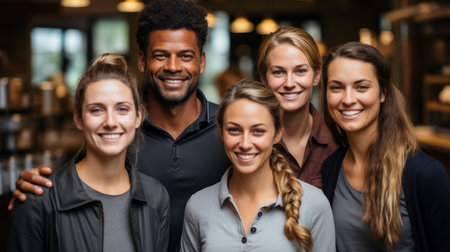 Portrait of smiling people standing in a row in coffee shop. Generative AI.