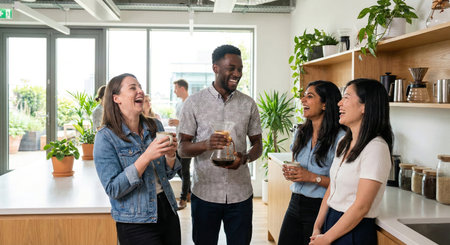 Diverse Group of Colleagues Laughing and Enjoying Coffee Break in Modern Office Pantry