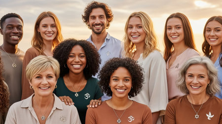 Diverse people smiling, diverse ages, outdoors, symbolic necklaces