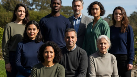 A multi-generational and ethnically diverse group of eight people standing and sitting together in an outdoor setting, likely a garden or park.