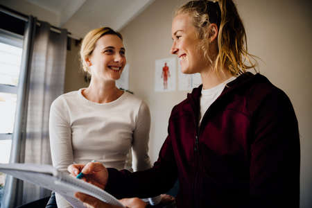 Young female patient and physiotherapist smiling while giving instructions sitting on massage bed in studio.
