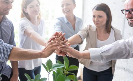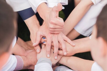 Close up view of young business people putting their hands together. Stack of hands. Unity and teamwork concept.