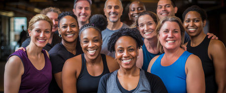 Multiethnic group of smiling adults gathered together in a gym, showing unity and joy in a fitness setting