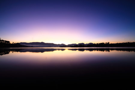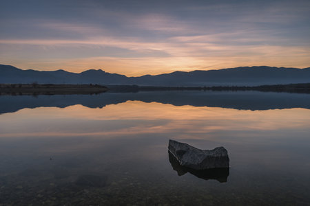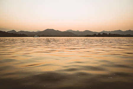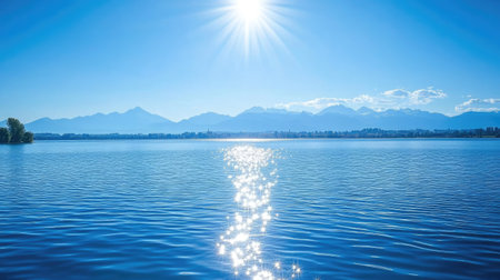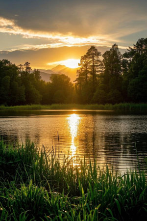 A breathtaking view of a warm sunset over a calm lake. The suns golden light reflects on the waters surface, with silhouetted hills in the distance and a peaceful shoreline.