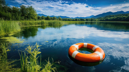 A bright orange life ring floats gently on a calm lake, surrounded by lush greenery and mountains. The scene captures tranquility and outdoor beauty.