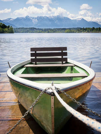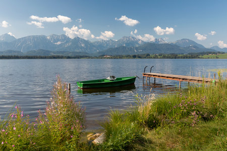 Boat and jetty on the picturesque Lake Hopfensee in the Allgäu (Bavaria) in summer
