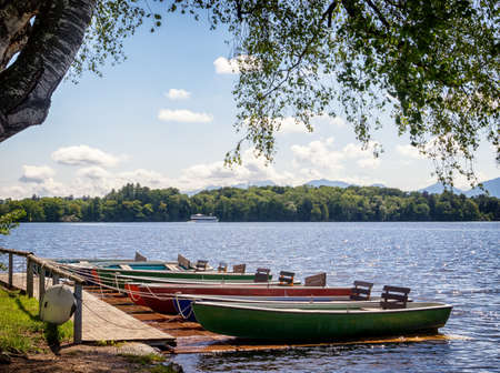 Blue Alps lake with Rental rowing boats in marina. Wharf for trip ships.