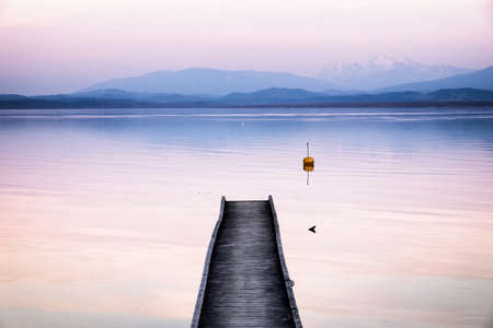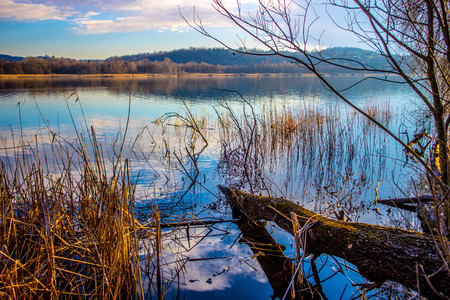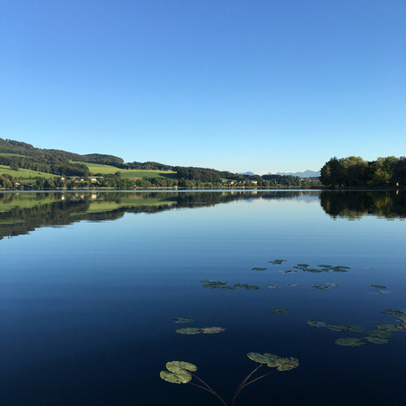 Beautiful morning mood on Lake Sempach in Switzerland. In the background Mount Rigi