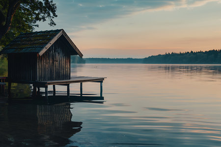 Generative AI Image of Small Wooden Home in Front Quiet Lake and Bright Sky Wallpaper
