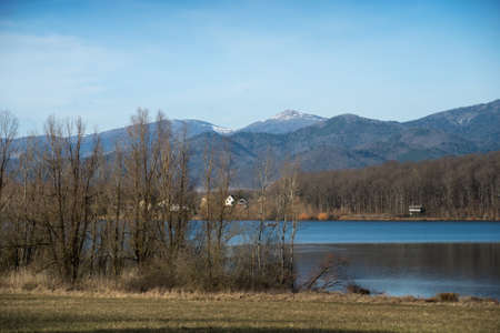 A quiet lake and snow-capped mountains, a serene autumn or spring landscape with the reflection of trees and reeds in calm water