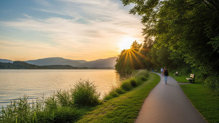 A pathway stretches alongside a calm lake under a colorful sunset. The image displays green grass, tall trees, and distant mountains. Warm sunlight bathes the scene. This picture could be used for promoting travel destinations or as a backdrop for various creative projects.