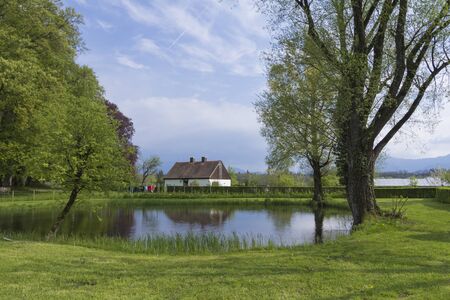 Landscape view over the Pond Schwaltenweiher with freshly mown meadow in the Ostallgaeu in summer.