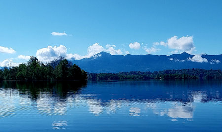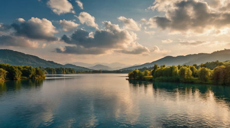 Tranquil lake panorama with mirror-like waters, verdant shores.