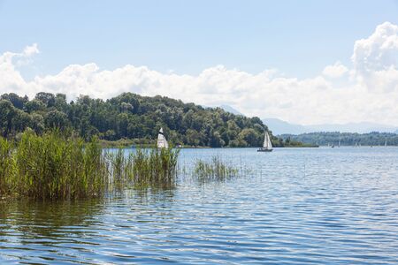 Lake Chiemsee, Bavaria, Germany - August 7th, 2016. Panoramic view along the bike path with some sailing boats in the foreground.