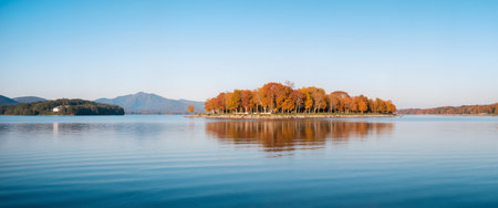 A panoramic view on the Faaker lake in Austrian Alps. The lake is surrounded by high mountains. Calm surface of the lake reflects the surrounding. Sweet flag at the shore. Clear blue sky. Serenity