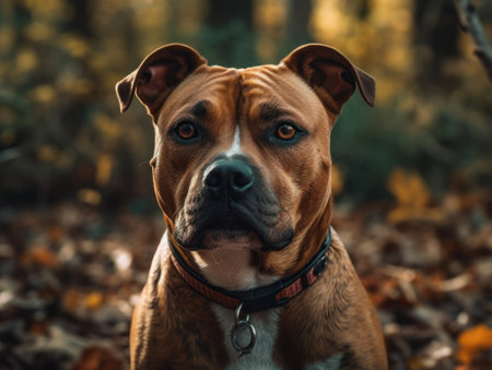 Red american staffordshire terrier with cropped ears walks outdoor in autumn park