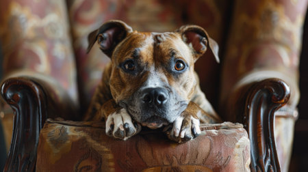 Bored 1-year-old female boxer pit bull mix dog with a sad expression on a chair during a rainy day indoors.