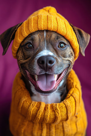A playful dog dressed in cozy red apparel shows off its charming personality.