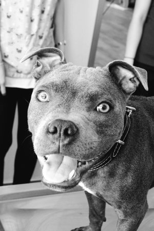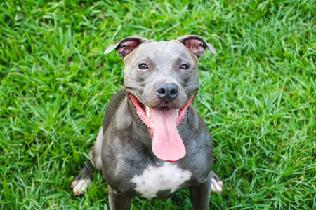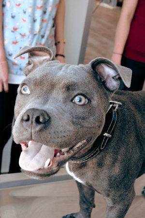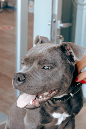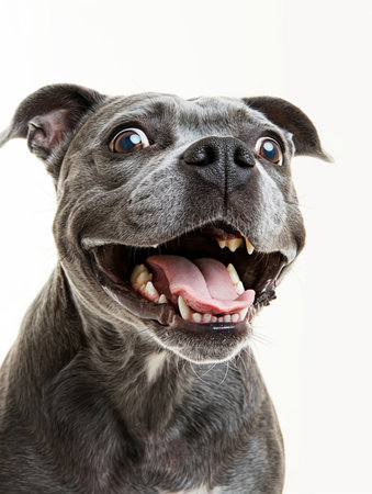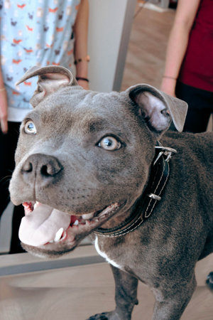 Portrait of dog with open mouth. One blue American staffordshire terrier. Amstaff, stafford.