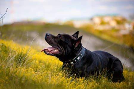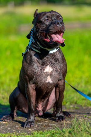 Portrait of American Staffordshire Terrier on a background of foliage, greenery. The concept of walking dogs, pets.