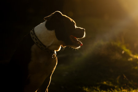 A muscular and confident Staffordshire Bull Terrier stands alert on a park pathway, bathed in warm evening light. Its sleek, reddish-brown coat gleams against the green grass.