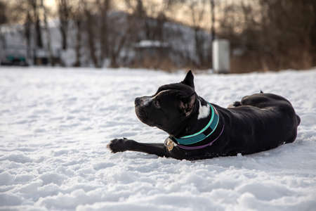 Beautiful and cute dog in the snow. Black and white American Staffordshire Terrier in winter.