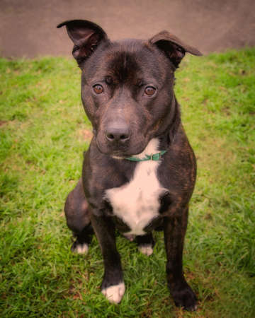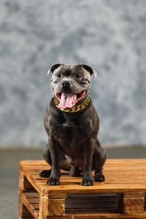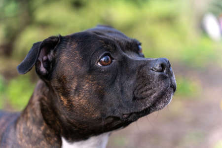 Pedigree Staffordshire Bull Terrier portrait on the blurry background