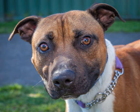 American bulldog, natural, outdoor portrait while he was waiting in line
