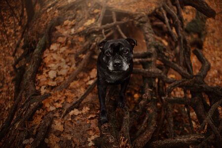Staffordshire Bull Terrier on a rock posing for a natural lighting outdoor portrait