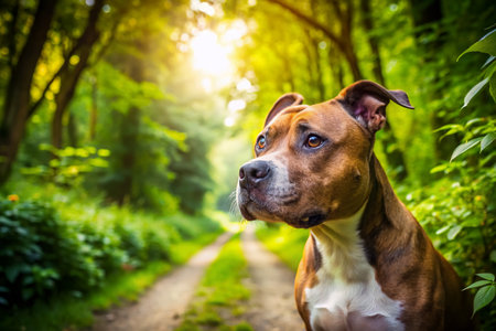 Staffordshire Bull Terrier Dog Gazing Down a Scenic Nature Path - Stock Photo