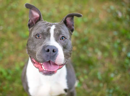 A blue and white Pit Bull Terrier mixed breed dog with floppy ears and a happy expression looking up at the camera