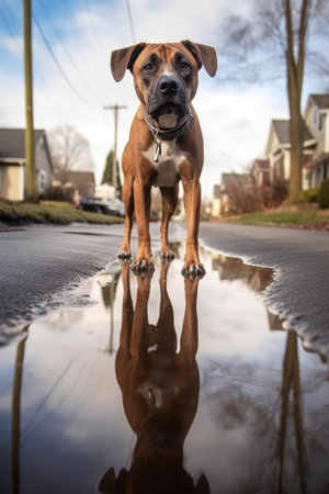 a dogs reflection in a puddle of water during a walk, created with generative ai